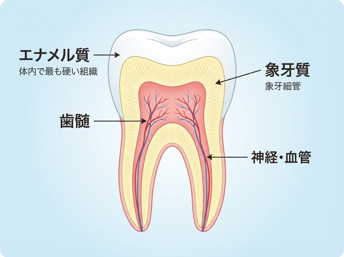 歯は、外側を覆う「エナメル質」と中層にある「象牙質」、歯の中心にある「歯髄」で構成されています。