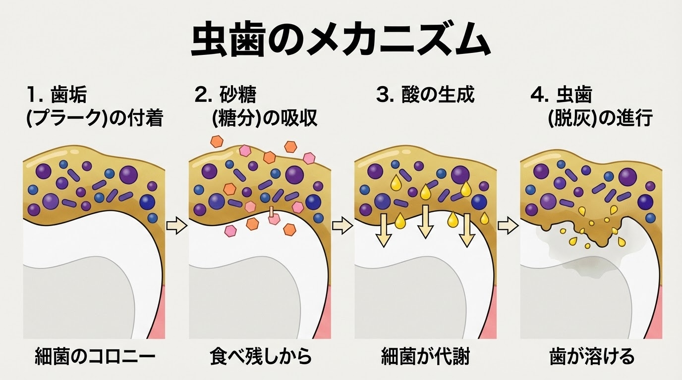 虫歯は、細菌が磨き残し(歯垢)を分解する際に放出する酸によって、歯の表面のカルシウムが溶けること(脱灰)で起こります。