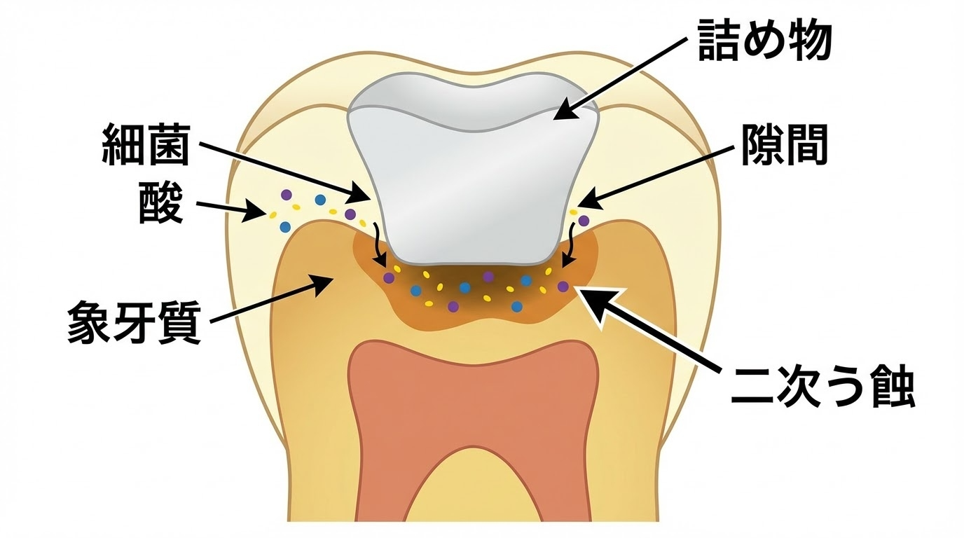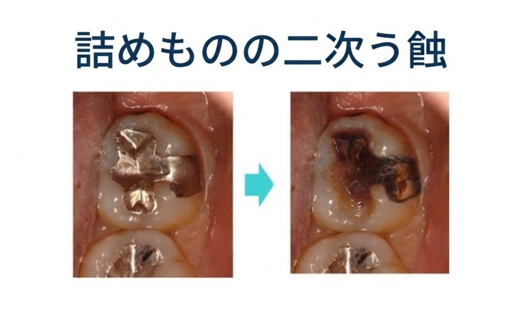 二次う蝕とは、古くなった詰め物や被せ物の周りにできた小さな隙間から細菌や酸が入り込み、歯の内部を虫歯にしてしまうことです。
