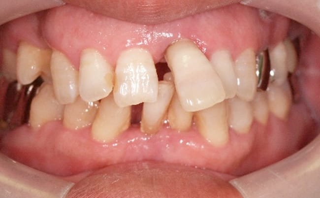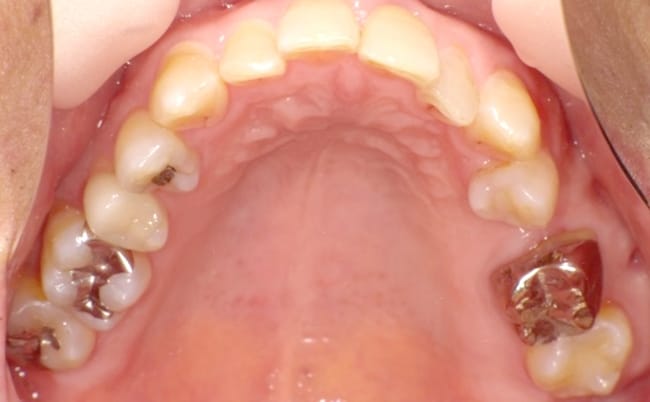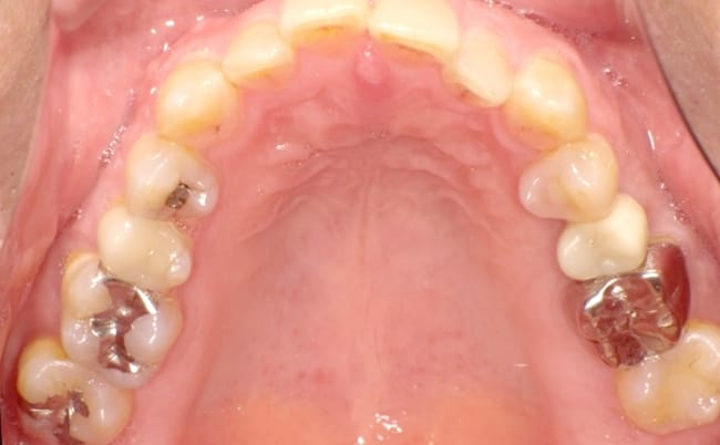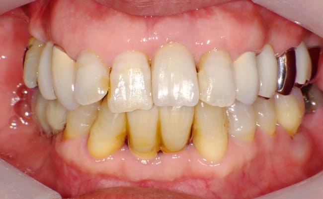 主訴 歯周病で歯が揺れて食事しにくい、前歯が出てきて見た目も悪い 診査診断 重度歯周病による歯牙動揺と咬合高径の減少 治療経過 歯周病治療後に保存不可能な歯を抜歯し、右の上下奥歯と上下前歯にインプラント治療を行いました 治療結果 奥歯でしっかり咬めるようになり、見た目も改善した 治療期間 2015年~2018年(歯周病治療も含む) -
